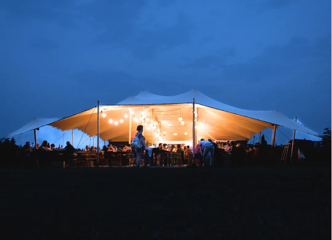 Ci spostiamo sotto la nostra nuova tensostruttura vista vigna, con oltre 150 posti coperti. Il panorama resta. Il gusto non cambia.